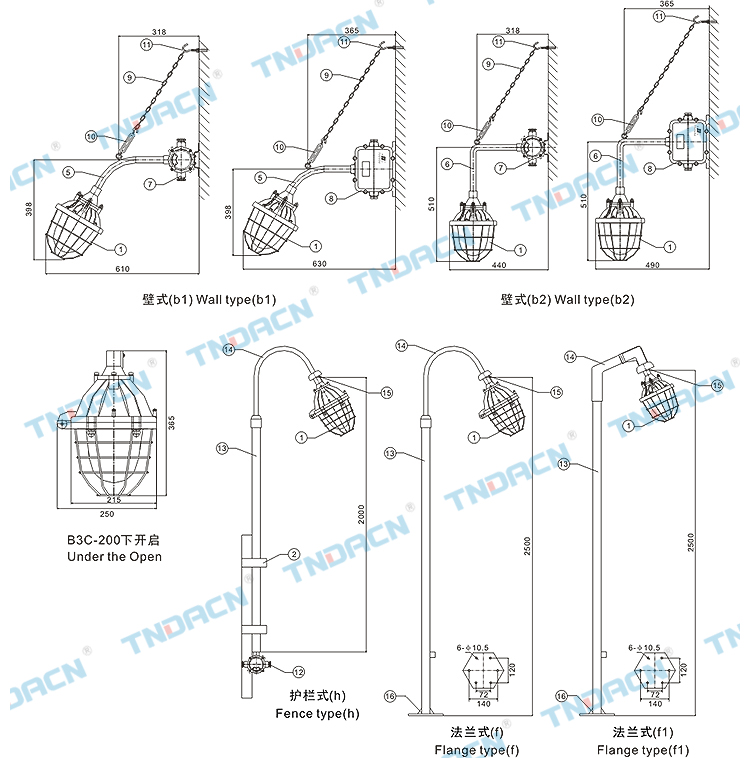 | 1.20区、21区、22区危险场所; 2.可燃性粉尘环境; 3.户内、户外(IP54、IP65*); 4.温度组别:T1~T4/T5/T6; 5.可配装白炽灯、汞灯、高压钠灯、金卤灯; 6.应用于石油、化工、航天、军工等场所。 |