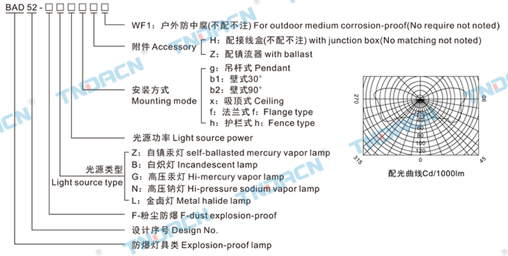 5.可配装白炽灯、汞灯、高压钠灯、金卤灯;