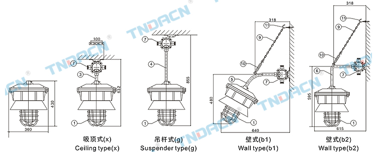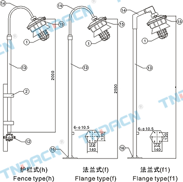 | 1.20区、21区、22区危险场所; 2.可燃性粉尘环境; 3.户内、户外(IP54、IP65*); 4.温度组别:T1~T4/T5/T6; 5.可配装白炽灯、汞灯、高压钠灯、金卤灯; 6.应用于石油、化工、航天、军工等场所。 |