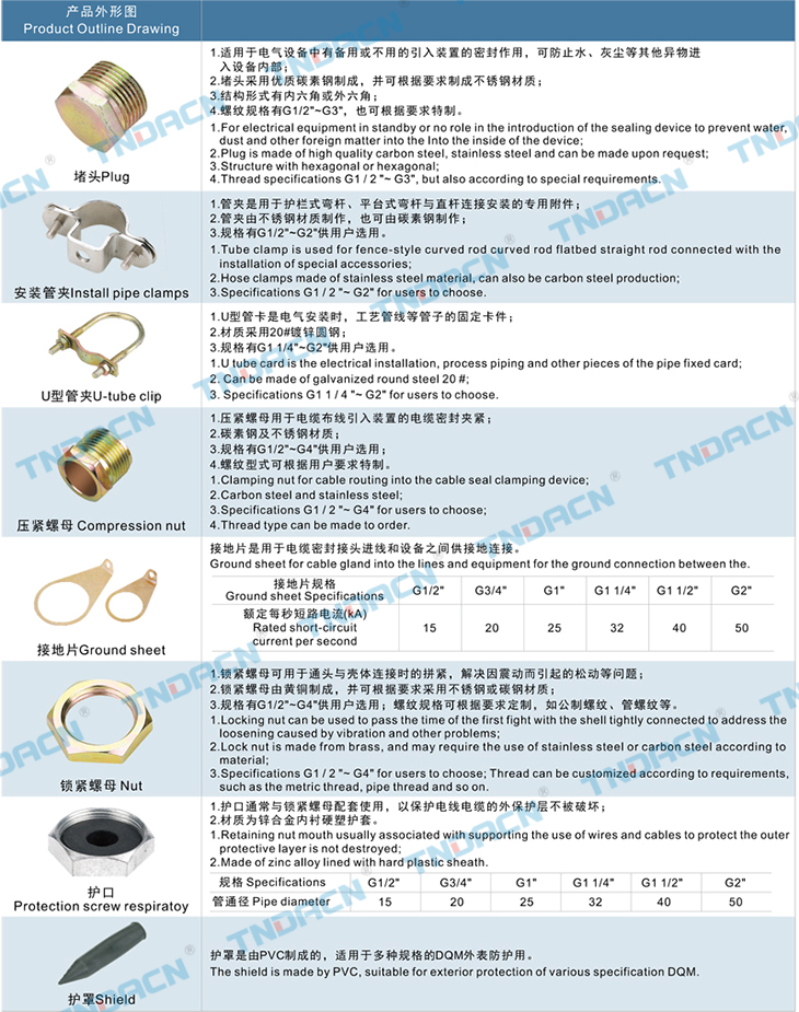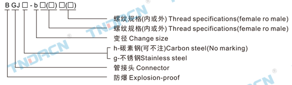 1.本产品采用优质碳素钢制成,表面镀锌或采用不锈钢。 2.螺纹规格可根据用户要求制作。 3.防爆标志:ExdⅡ等效于 Ⅱ2G ExdⅡ(欧标) 1.It's made of carbon steel with good quality, the surface is done with galvanization, or it canbe made of stainless steel; 2.The thread specification can be made on request. 3.Ex-mark:ExdⅡequivalent to Ⅱ2G ExdⅡ(European standard)