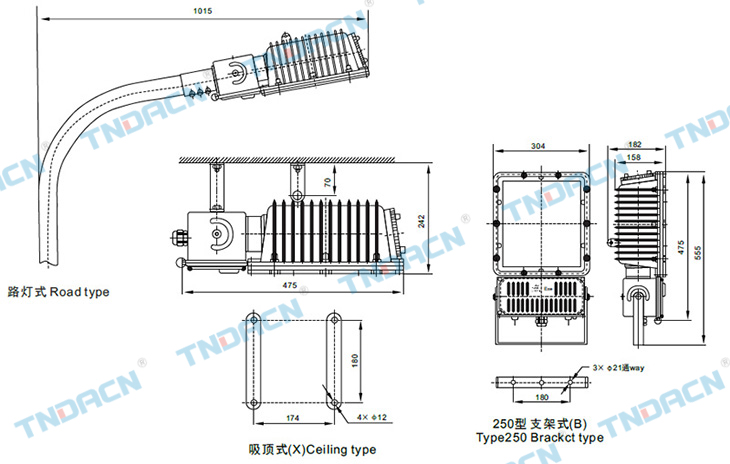 1.壳体采用高强度合金铝一次性压铸成型,表面经高速抛丸清理后高压静电喷塑。外壳结构紧凑合理、材质密度高强度好、 防爆性能优良,表面塑粉附着力强具有良好的防腐能力,表面光洁,美观大方; 2.高硼硅玻璃,透光性好,不锈钢外露紧固件; 3.灯体可水平安装或壁式安装,45~90°可调; 4.灯具与镇流器等附件为一体式设计,便安装维修。有较强的防水性能,可用于石油平台及油轮舰艇等恶劣环境场所; 5.反光罩经过专业二次配光设计,并得到实际应用验证,采用镜面不锈钢反射板,照射角幅度大;可加装补偿电容,补偿后CosФ≥0.8; 6.电缆布线。 1.Shell made of high strength aluminum alloy casting off the surface after blast cleaning by high voltage electrostatic spray. Shell compact structure, high density material strength, Explosion-proof performance, the surface of plastic powder adhesion ability with good anti-corrosion, the surface smooth, elegant appearance; 2.Lamp housing is made of high borosilicate glass with great transmittance. Outer fasteners are made of stainless steel. 3.It can have horizontally installation or walled installation. Adjusting in the range of45°~90°. 4.Lamp and ballast are designed holistically to install and maintain conveniently. Using in the petroleum platform, tanker,ships and so on, it has fine water proof function. 5.The reflect should get special software design of distribution for two times, and it can have the confirmation of actual test. The baffle board ismade of mirror finished stainless steel. It makes the light soft and make the irradiation range large. We can also add the compensation capacitor.cosФ≥0.8 6.Wiring with cables.