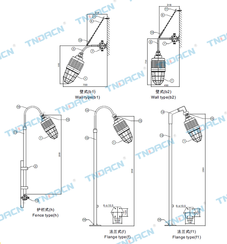 5.可配装白炽灯、汞灯、高压钠灯、金卤灯;