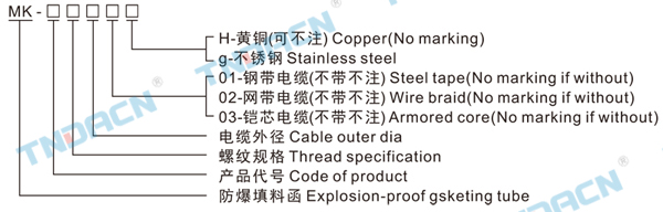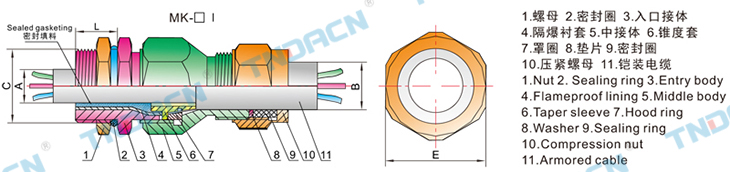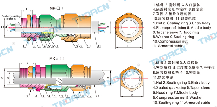 1.采用黄铜、不锈钢制成,黄铜表面可纯化处理也可镀镍; 2.电缆采用填料密封; 3.具有快捷安装、安全可靠、防护性能好、防爆性能优越 等特点; 4.适用于夹持和固定各种类型的钢芯、钢丝编织或带状铠 装电缆,用于必须对电缆芯线部分隔爆及外壳气体密封 达IP66的场所,防爆标志为: ExeⅡ等效于 Ⅱ2G ExeⅡ(欧标) ExdⅡ等效于 Ⅱ2G ExdⅡ(欧标) 1.It's made of copper or stainless steel material, Copper surfacecan be passivated or nickel plated; 2.Cable is sealed with gasketing; 3.With reliable installation, good protection and explosion-proof function; 4.Iso lating gasketing tube is suitable for clamping or fixingsteel wire knit or armour cable, its cable core and enclosuregassealing protection must be IP66, Ex-mark:ExeⅡ is equal toⅡ2G ExeⅡ(European Standard)