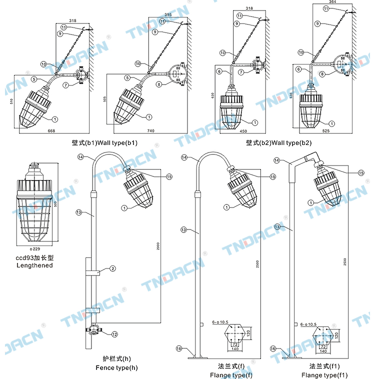 | 1.20区、21区、22区危险场所; 2.可燃性粉尘环境; 3.户内、户外(IP54、IP65*); 4.温度组别:T1~T4/T5/T6; 5.可配装白炽灯、汞灯、高压钠灯、金卤灯; 6.应用于石油、化工、航天、军工等场所。 |