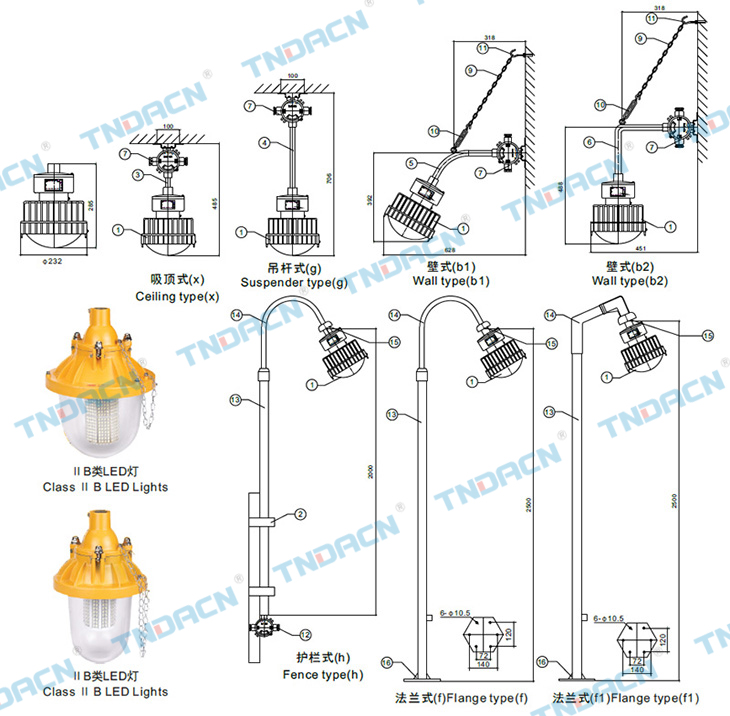 1.1区、2区危险场所或20区、21区、22区危险场所; 2.ⅡA、ⅡB、ⅡC爆炸性气体环境或可燃性粉尘环境; 3.户内、户外(IP54、IP65*); 4.温度组别:T1~T4/T5/T6; 5.可配装白炽灯、汞灯、高压钠灯、金卤灯; 6.应用于石油、化工、航天、军工等场所。