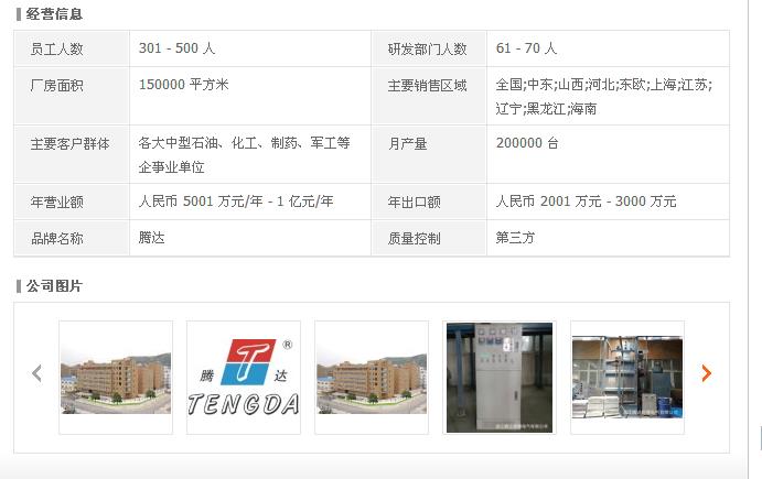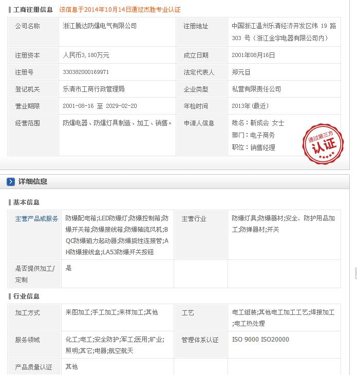 下面内容这是经阿里巴巴诚信通认证的,阿里巴巴专人上门取证的真实公司档案资料。现在此公布,以以供客户朋友作为企业信用查询。客户朋友也可以登录腾达防爆阿里巴巴诚信通网站查询。http://shop1383584226760.1688.com/page/creditdetail.htm